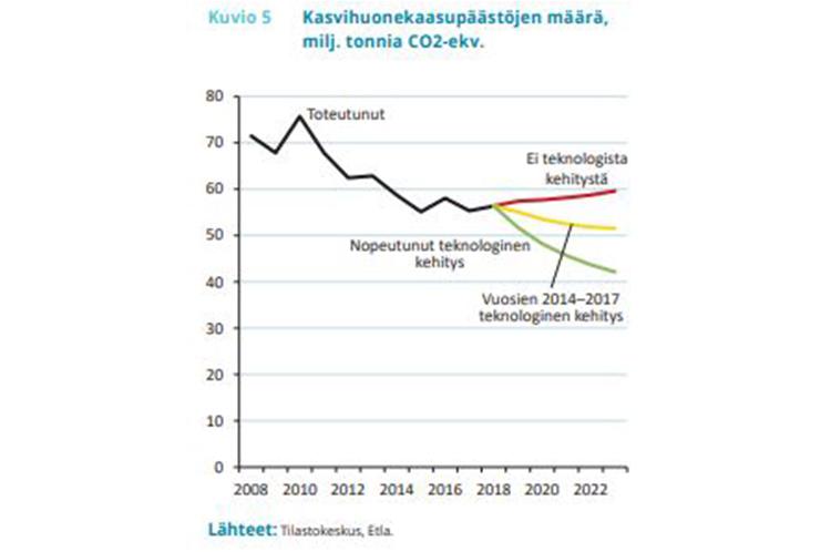 Etlan tutkijan Ville Kaitilan selvityksen mukaan Suomen päästöjen määrä vähenee vuoteen 2023 asti keskimäärin vajaat kaksi prosenttia vuodessa, ellei päästöintensiivisyyden aleneminen nopeudu. Ilman teknologisen kehityksen kiihtymistä tai hiilinielujen lisäämistä Suomi ei siten tule pääsemään hiilineutraalisuustavoitteeseensa.