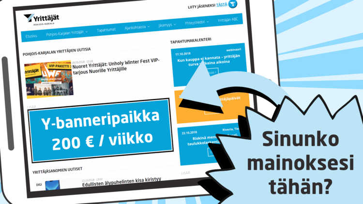 Verkkosivujemme Y-banneripaikka tarjoaa jäsenhinnalla 200 € + alv näkyvän paikan etusivultamme viikon ajaksi. Huom! Tarjous myös ei-jäsenille, jolloin hinta 300 € + alv. Banneripaikkaan sisältyy suoraohjauslinkki haluamallesi verkkosivulle. Bannerin koko tulee olla mitoissa 980 x 230 px, sekä sen tulee olla sovelias kohderyhmälle (yrittäjät ja yrittäjämieliset) ja hyvän maun rajoissa.