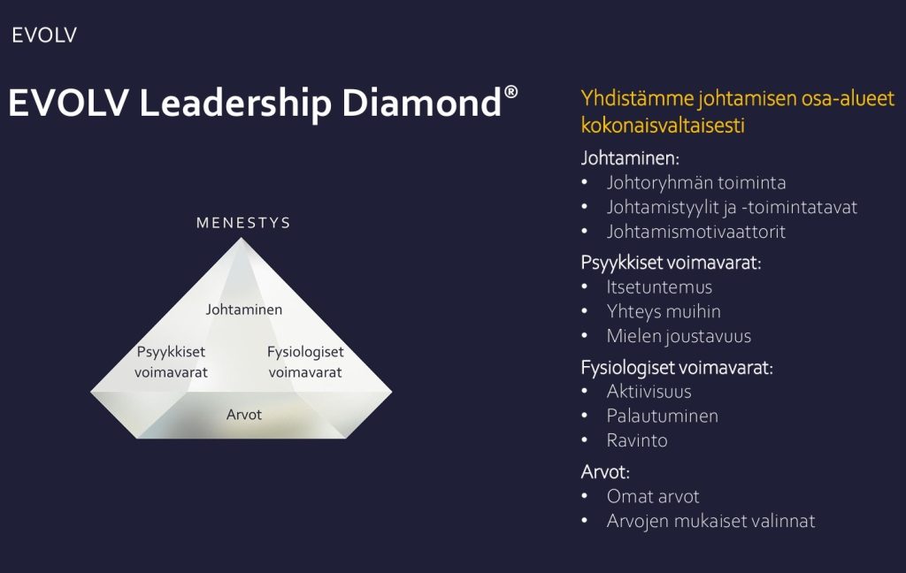 Yritykseni konsultointi- ja Coaching-yhtiö EVOLV Oy, joka valmentaa johtajia kestävään menestykseen. Menestys tarkoittaa niin työelämää kuin mahdollisuutta elää merkityksellistä ja tasapainoista elämää. Palvelumme perustuvat asiantuntijatiimimme laaja-alaiseen ja syvälliseen osaamiseen, ainutlaatuiseen EVOLV Leadrship Diamond -menetelmään, laadukkaisiin työkaluihin ja viimeisimpään tutkimustietoon.