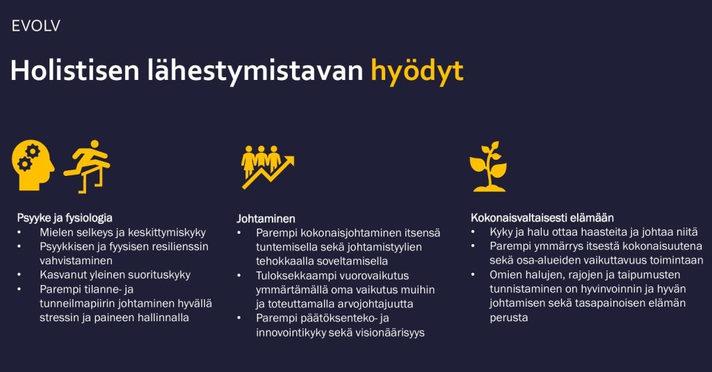 EVOLV Oy:n arvo syntyy valmentajien erikoisosaamisten holistisella yhdistämisellä siten, että palvelu vaikuttaa enemmän osa-alueet erillään. Osa-alueet (arvot, psyykkiset voimavarat, fysiologiset voimavarat ja johtamisen taidot) valmennetaan uusimpien tutkimustulosten ja modernin teknologian avulla.