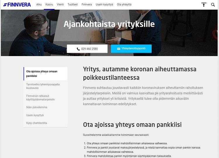 Finnvera suhtautuu joustavasti kaikkiin koronaviruksen yrityksissä aiheuttamiin rahoituksen järjestelytarpeisiin. Finnvera rahoittaa pk-yrityksiä poikkeustilanteessa takauksin, jolloin yrittäjä on ensin yhteydessä pankkiin ja pankki hakee takauksen yrityksen puolesta Finnverasta. Finnvera käsittelee takaushakemuksen nopealla prosessilla. Yrityksellä tulee olla pidemmän aikavälin kannattavan toiminnan edellytykset.