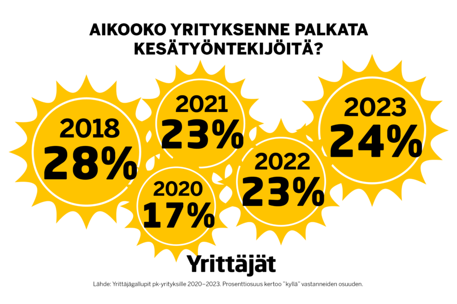 Kesätyöntekijöitä aikoo palkata nyt 24 prosenttia yrityksistä, luku oli vuonna 2022 ja 2021 23 prosenttia. Pandemian alkamisvuonna 2020 kesätyöntekijöitä aikoi palkata vain 17 prosenttia yrittäjistä ja tätä ennen kaksi vuotta aiemmin vuonna 2018 28 prosenttia yrittäjistä.