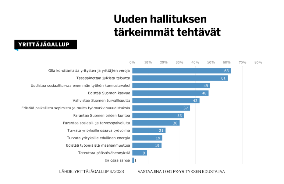 Yrittäjien mielestä uuden hallituksen tärkeimmät tehtävät ovat huolehtia, että yritysten ja yrittäjien veroja ei koroteta (63 prosenttia vastaajista), taloutta tasapainotetaan (61 prosenttia) ja sosiaaliturvaa uudistetaan (49 prosenttia).