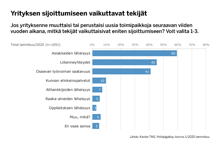 Asiakkaiden läheisyys (60 prosenttia vastaajista), liikenneyhteydet (45 %) ja ammattitaitoiset työntekijät (41 %) nousivat kärkeen, kun yrittäjiltä kysyttiin, mitkä tekijät vaikuttaisivat eniten uuden toimipaikan sijaintiin. Vaihtoehtoja sai valita useampia.