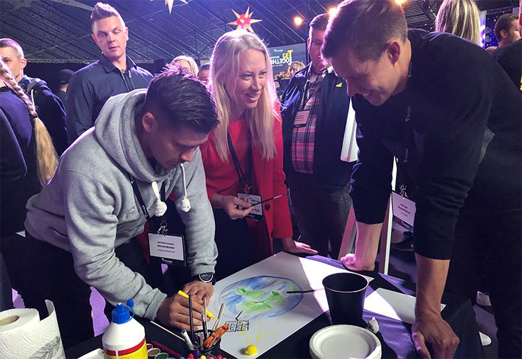 Osallistujat oli jaettu verkostoitumismielessä ryhmiin, joilla kaikilla oli pohjalaiset nimet. Eheroontaharoon-ryhmästä löytyivät tamperelainen Veli-Pekka Franssila, vaasalainen Johanna Tidström ja tamperelainen Jarmo Laine, jotka värittävät piirustusta maapallosta.
