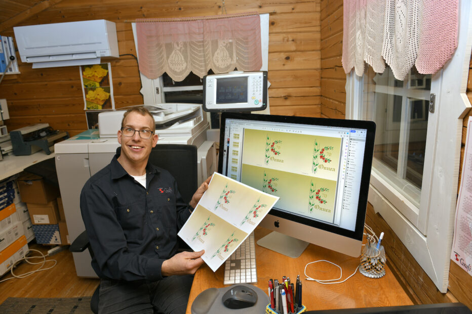 – Yrityksen kautta pystyn työllistämään itseni, vaikka suurista voitoista ei voi kerskua. Menot ja tulot ovat kuitenkin balanssissa jopa siinä määrin, että olen pystynyt lisäämään laitekantaani. Tilan laajeneminen antoi mahdollisuuden hankkia painokoneen kylkeen lisäpaperilokerot, jonka myötä paperin ohisyöttötarve laski minimiin. Mieluummin teen jotain, kuin esimerkiksi pyörittelen peukaloita.