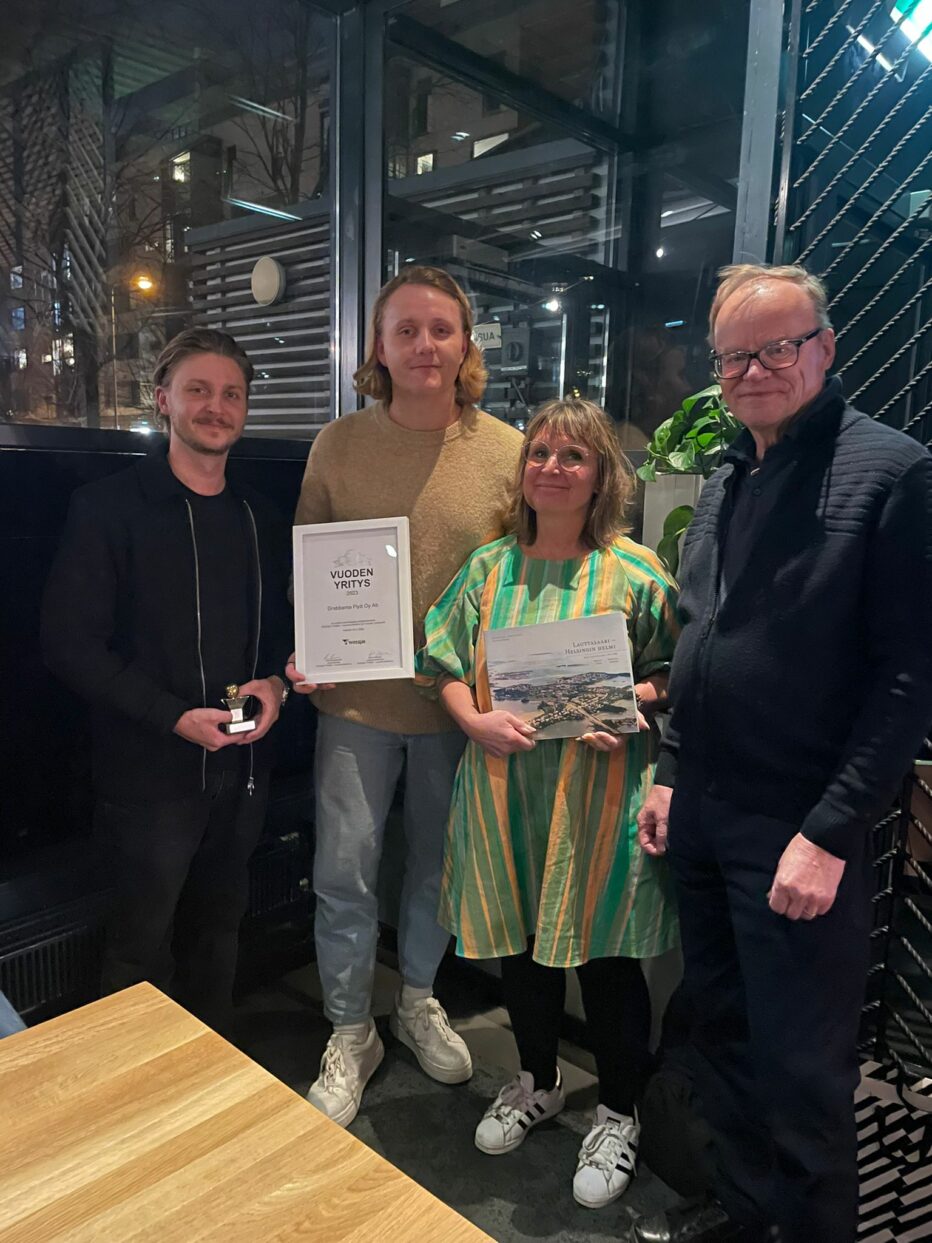 Lounais-Helsingin paikallisyhdistys palkitsi Vuoden yrityksenä 2023 lauttasaarelaisen Grabbarna Flytt Oy Ab:n. Kuvassa kaksi yrityksen perustajista, Mikael Sarpaneva ja Rudolf Ekström sekä Lounais-Helsingin paikallisyhdistyksen Kirsi Kankaanpää ja Esko Valkeala. Palkintoa juhlittiin Ravintola Farossa yhdessä Grabbarna-yrittäjien ja paikallisyhdistyksen hallituksen kanssa.