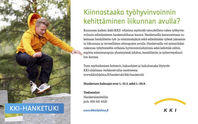 KKI-hanketuella on perustettu muuan muassa yrityksiin ja paikallisiin yrittäjäjärjestöihin erilaisia liikuntahankkeita, joilla on tuettu henkilöstön työ- ja toimintakykyä. Seuraavan kerran KKI-hanketukea voi hakea 1.-30.9.2017. Lisätietoja ja hakuohjeet löytyvät täältä.