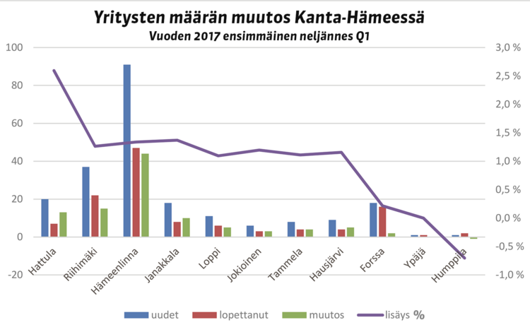 Alkaneen vuoden ensimmäisellä vuosineljänneksellä maakuntaan syntyi 220 uutta yritystä. Vastaavasti 120 yritystä lopetti, joten nettosaldoksi jäi valtakunnallisestikin huipputulos: yritysten määrä kasvoi tasan sadalla. – Yrityskunnan uusiutuminen on terve ilmiö ja kertoo omalta osaltaan alueen yrityksien kyvystä selviytyä myös omistajanvaihdoksista. Nettolisäys puolestaan kertoo alueen elinkeinorakenteen ja palveluiden monipuolistumisesta, Hämeen Yrittäjien Juha Haukka toteaa.