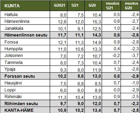 Työttömyys on vähentynyt viidenneksellä verrattuna vuoden takaiseen tilanteeseen. Kanta-Hämeessä oli kesäkuun lopussa 8500 työtöntä työnhakijaa, eli hieman yli joka kymmenes oli työtä vailla. Lopella, Jokioisilla ja Hausjärvellä työttömyys oli matalinta ja lähes samalla tasolla verrattuna koronaa edeltävään aikaan.