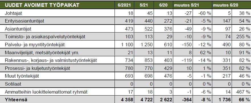 Kesäkuussa Hämeessä ilmoitettiin yhteensä 4 358 uutta avointa työpaikkaa. Se on yli puolet enemmän kuin vuotta aiemmin. Eniten uusia mahdollisuuksia avautui lähihoitajille, konepaja- ja metallituotteiden kokoonpanijoille, avustaville keittiötekijöille, kuorma-auton ja erikoisajoneuvojen kuljettajille, myyjille sekä metalliteollisuuden prosessityöntekijöille. Tilastojen mukaan avoimet työpaikat syntyivät pääosin alueen pieniin- ja keskisuuriin yrityksiin.