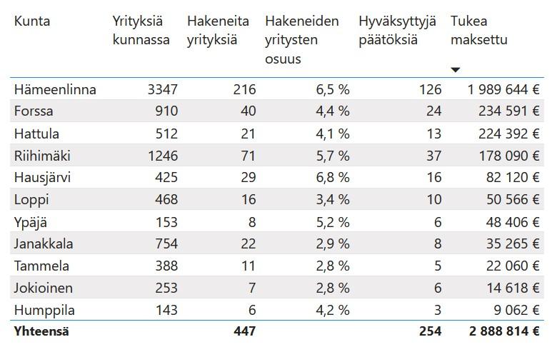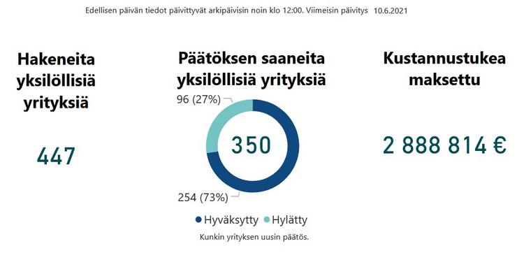 Kesäkuun toiseen viikkoon mennessä 447 kantahämäläistä yritystä oli hakenut kustannustuen uusinta versiota. Heistä 350 on saanut päätöksen ja niistä myönteisiä on ollut 254.