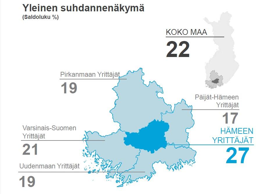 Hämeessä neljä yritystä kymmenestä odottaa tulevien suhdanteiden näyttäytyvän heille myönteisinä ja noin puolet näkevät tilanteen ennallaan. Vain yksi kymmenestä odottaa suhdanteiden vaikeuttavan heidän liiketoimintaansa seuraavan vuoden aikana. Takana tosin on hankala vuosi ja enemmän kuin joka viides yritys kokee tilanteen olevan juuri nyt heikompi, kuin viime vuonna vastaavaan aikaan.