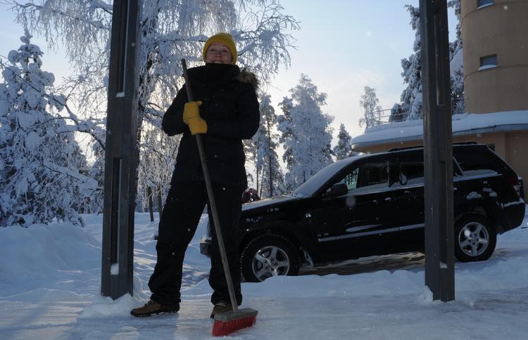 Kangasalan korkeimmalta kohdalta, jyrkän kirkkoharjun huipulta löytyy lumitöitä tekevä yrittäjä. Lunta on tuiskutellut yön aikana tällä kertaa vain pari senttiä, joten mitenkään kohtuuttoman kovasta urakasta ei nyt ole kyse. Yrittäjä Mari Koponen on saapunut paikalle lähinnä vain jutun tekoa varten. Varsinaisesti Kirkkoharjun kahvila avaa ovensa vasta myöhemmin.