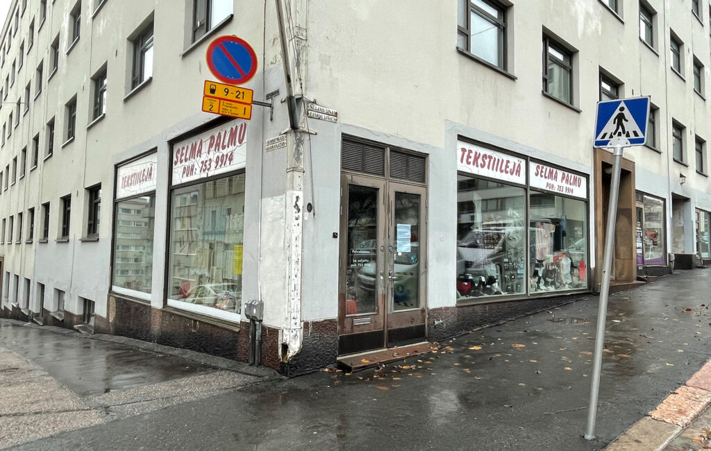 Neljännellä linjalla on näyteikkunalla myynti-ilmoitus: Selma Palmu hakee yrittäjää jatkamaan Helsingin vanhimpiin kuuluvaa tekstiililiikettä. Sisällä eteisessä lukitun oven takana palaa led-kynttilä.
