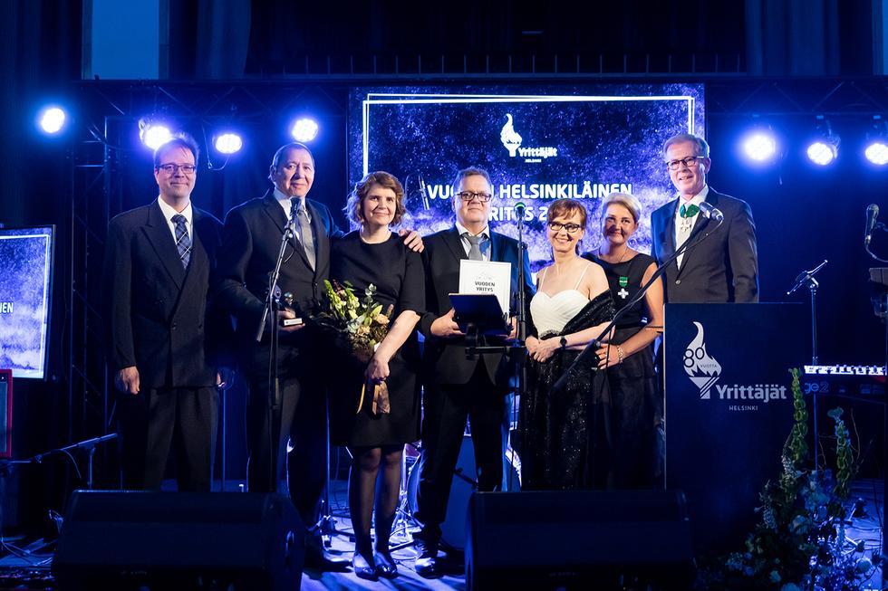 Illan kohokohta oli Vuoden 2019 helsinkiläisen yrityksen julkistaminen. Palkinnon ansaitsi Haagan Leipä Oy, josta palkinnon vastaanottivat yrittäjät Pasi ja Virve Turunen (kuvassa toinen ja kolmas vasemmalta) ja Kari Saarto (keskellä). Palkinnon jakoivat Helsingin Yrittäjät – Länsi-Helsinki ry:n puheenjohtaja Jukka Tiihonen (vasemmalla), Suomen Yrittäjien puheenjohtaja Jyrki Mäkynen (oikealla), Helsingin Yrittäjien puheenjohtaja Mari Laaksonen (toinen oikealta) ja Helsingin Yrittäjien toimitusjohtaja Tiina Oksala (kolmas oikealta). Lue uutinen palkinnosta >>