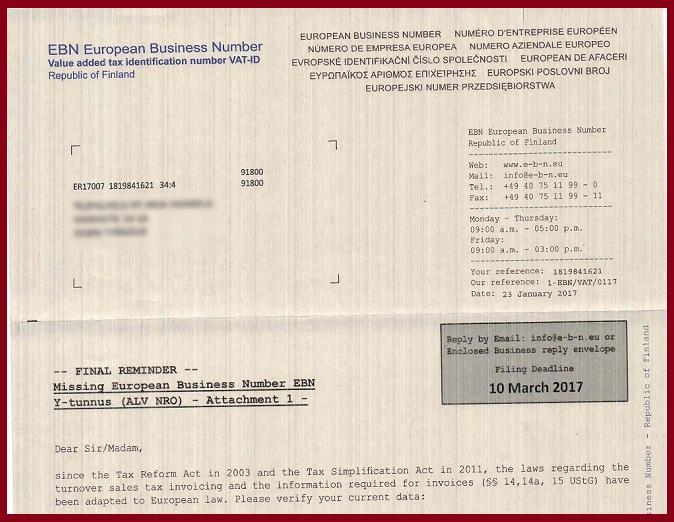 Tuolloin Saksan Hampurissa olevaan osoitteeseen merkitty European Business Number kertoi keräävänsä tietoja eurooppalaiseen yritysrekisteriin.