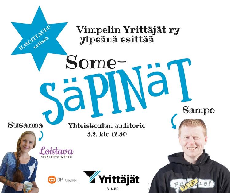 Itse tilaisuuteen annetaan seuraavat ohjeet: Kännykkää saa käyttää, kuvia saa ottaa ja käyttää tägejä #somesäpinät #saasomettaa #vimpelinyrittäjät.