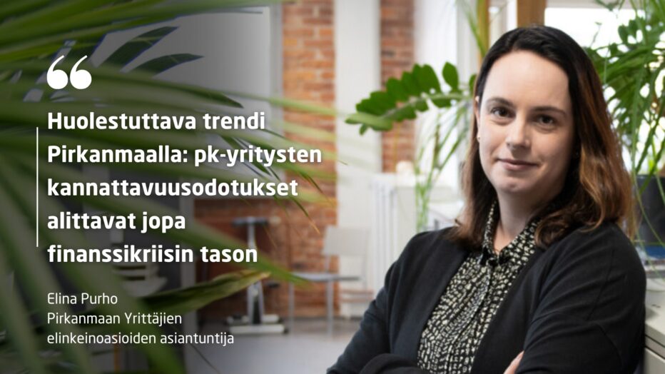 – Laskusuuntainen trendi pirkanmaalaisten pk-yritysten kasvuhakuisuudessa on erittäin huolestuttavaa. Etenkin, kun samaan aikaan myös kannattavuusodotukset sukeltavat voimakkaan negatiivisissa lukemissa. Kasvu lähtee pk-yrityksistä ja meidän on saatava myös Pirkanmaan yritykset haastavien vuosien jälkeen takaisin jaloilleen ja kasvu-uralle. Positiivista on kuitenkin rakennusalan varovaisen kohentunut tilanne, mikä antaa laajemminkin viitettä positiivisemmasta suunnasta, Pirkanmaan Yrittäjien elinkeinoasioiden asiantuntija Elina Purho kommentoi.
