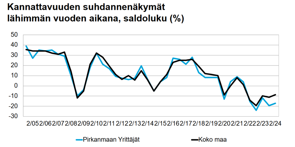 Pk-yritysten suhdanneodotukset ovat kohentuneet viime keväästä, erityisesti inflaation hidastumisen ja laskevien korkojen ansiosta. Pirkanmaan pk-yrittäjien suhdannenäkymä on kuitenkin Suomen keskiarvoa hieman matalampi. Myös arviot työllisyyden, liikevaihdon ja kannattavuuden kehityksestä alittavat Suomen keskimääräisen tason.
