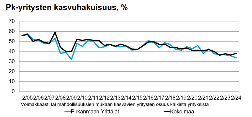 Pirkanmaa eroaa muusta Suomesta myös kasvuhakuisuuden heikentymisenä. Kasvuhakuisten yritysten määrä jatkaa laskuaan, kun muualla Suomessa tilanne on tasaantumassa tai jopa maltillisesti kasvusuuntainen.