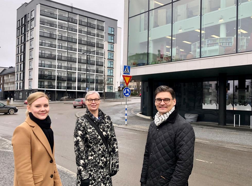 TÄSSÄ JUTUSSA haastateltu trio lähetti Nokian keskustassa otetun kuvan. Siinä ovat markkinointipäällikkö Laura Niittymäki (vas.), elinkeinojohtaja Tiina Laakkonen ja oikealla kaupunkikehitysjohtaja Mikko Nieminen. Etualalla oikealla näkyy Nokian uusi kirjasto- ja kulttuuritalo Virta ja takana uusi kerrostalo As Oy Nokian Pirkkalaistorin Piccolo. Kuva: Päivi Koskinen