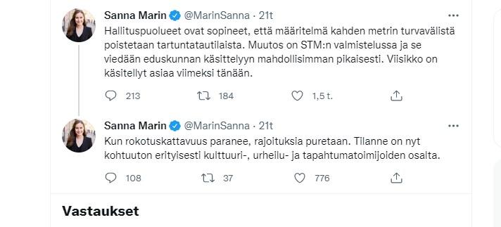 Etelä-Suomen aluehallintovirasto on kumoamassa pääkaupunkiseudun koronakoordinaatioryhmän suosituksen mukaisesti yleisötilaisuuksien järjestämistä koskevan niin sanotun lohkovaatimuksen. Lisäksi virasto varautuu 2 metrin turvavälivelvoitteen poistamiseen, jota koskevan tartuntatautilain muutoksen pääministeri Sanna Marin kertoi Twitter-päivityksessään olevan valmistelussa sosiaali- ja terveysministeriössä ja se esitellään eduskunnalla ensi viikolla.