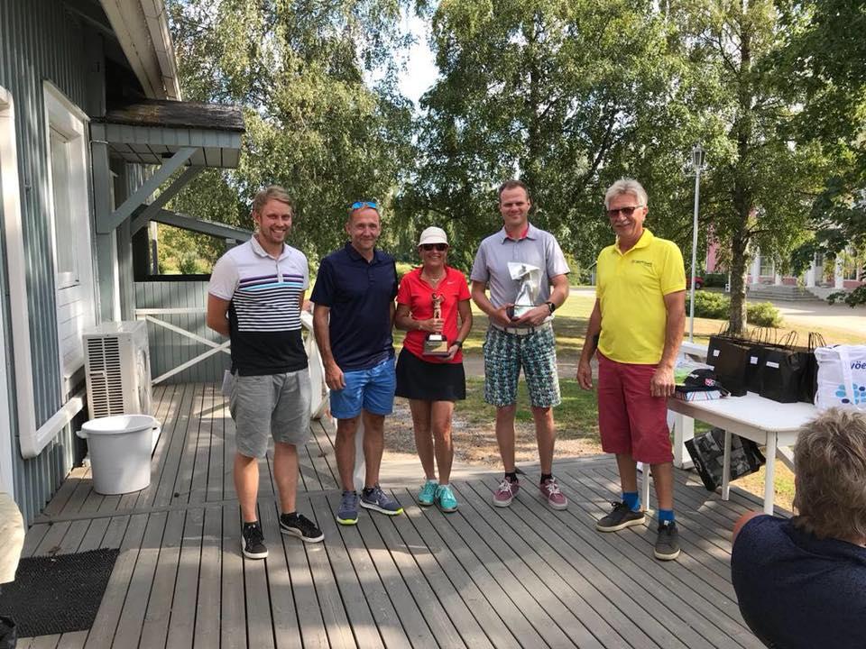 Kuvissa mukana kilpailun järjestelyistä vastanneet Heikki Tynkkynen Etelä-Savon Yrittäjistä, aluejohtaja Harri Jääskeläinen Fenniasta sekä toiminnanjohtaja Eero Sistonen Rantasalmi Golfista.