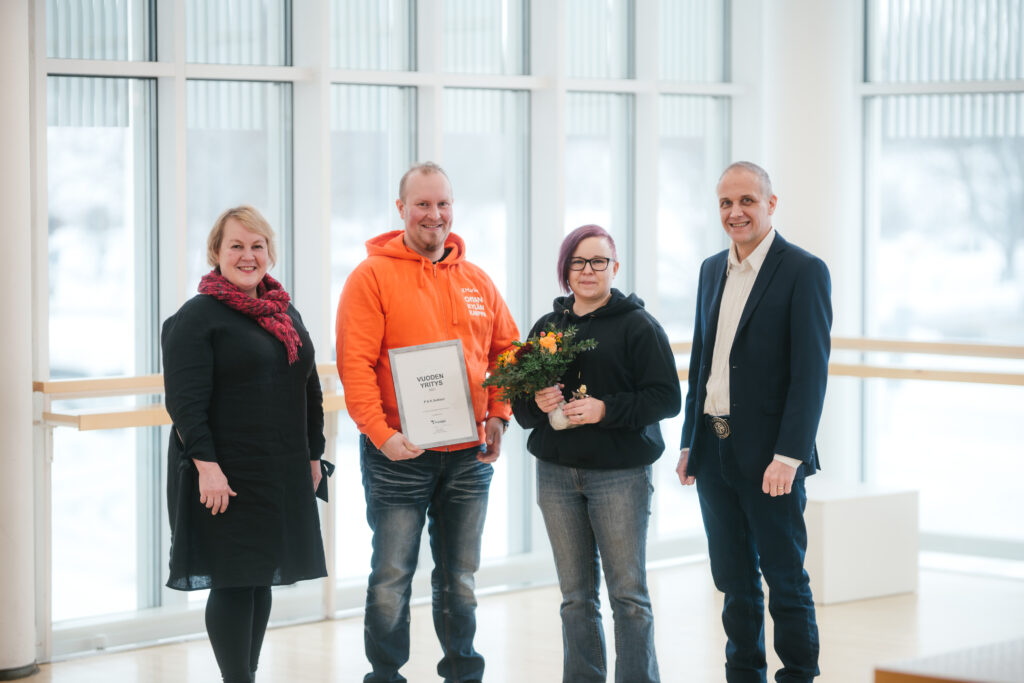 Palkinnon luovuttivat Imatran Seudun Yrittäjien puheenjohtaja Markus Sainio ja varapuheenjohtaja Anne Repo ja sen vastaanotti Kirsi ja Petri Soikkeli. www.k-ruoka.fi/kauppa/k-market-hermanni