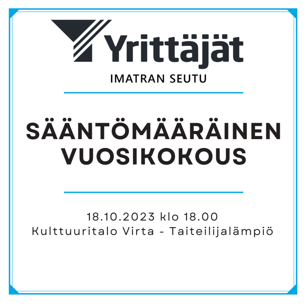 Tervetuloa kaikki Imatran Seudun Yrittäjät! Kutsumme teidät lämpimästi mukaan sääntömääräiseen vuosikokoukseemme, joka järjestetään 18.10. klo 18.00. Kokouspaikkana toimii Kulttuuritalo Virta – Taiteilijalämpiö.