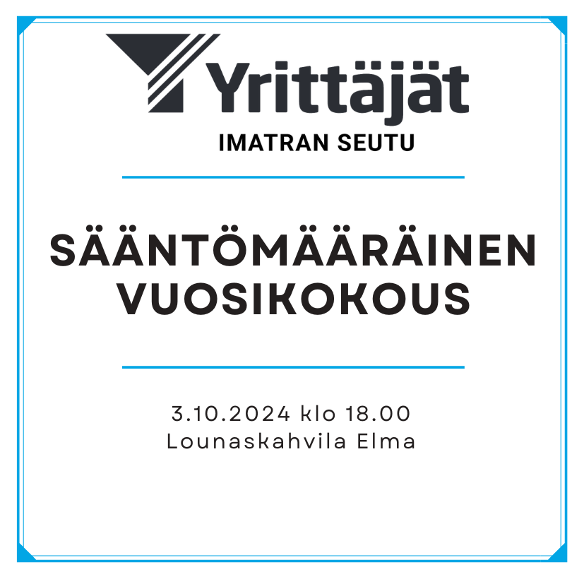 Tervetuloa kaikki Imatran Seudun Yrittäjät! Kutsumme teidät lämpimästi mukaan sääntömääräiseen vuosikokoukseemme, joka järjestetään 3.10. klo 18.00. Kokouspaikkana toimii Lounaskahvila Elma, Anjankuja 1, 55100 Imatra.