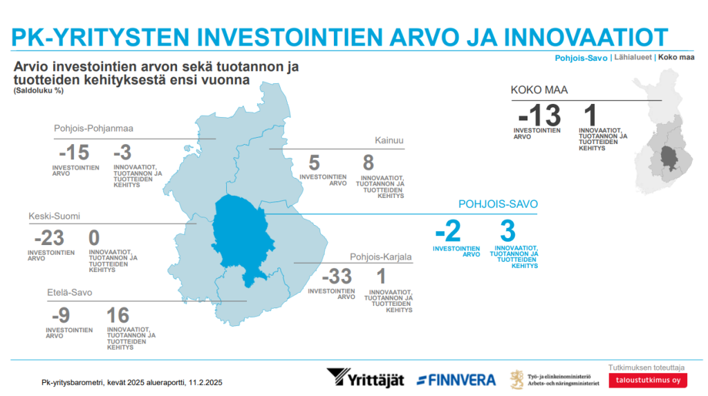 Sen sijaan pitkään vaivannut investointilama on hellittämässä, sillä odotukset investointien arvon sekä tuotannon ja tuotteiden kehityksestä ensi vuonna ovat parantuneet selvästi syksyn tilanteesta erityisesti Kuopion seudulla. – Tämä on barometrin valonpilkkuja ja tarkoittaa, että rahoituksen kysyntä lisääntyy seuraavan vuoden aikana, arvioi Savon Yrittäjien toimitusjohtaja Paula Aikio-Tallgren. Investoinnit tulevat kohdistumaan kone-, laite- tai rakennusinvestointeihin sekä käyttöpääomarahoitukseen.