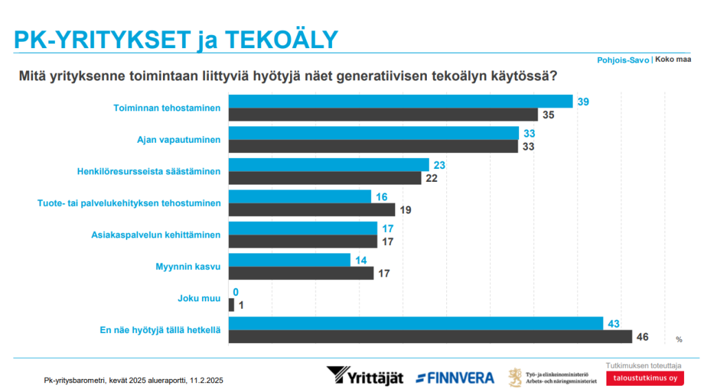 Tekoälysovellukset ja ohjelmistorobotiikka tulevat lisääntymään pk-yrityksissä seuraavien 12 kk aikana. Niihin pohjoissavolaiset yritykset panostavat maan keskiarvoa enemmän. Tällä hetkellä generatiivista tekoälyä hyödynnetään ideoinnin apua, kielikäännöksissä, markkinoinnin tai myynnin kasvattamiseen sekä viestinnässä. Tekoälystä odotetaan tulevaisuudessa apua kuitenkin toiminnan tehostamiseen, työajan säästöön sekä henkilöresurssien korvaajaksi.