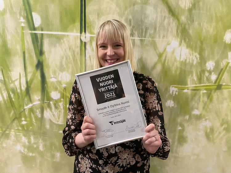 Vuoden 2021 nuori yrittäjä on turkulainen, 29-vuotias Irina Nurmi Smooth it Oy:stä. Vuodesta 2015 yrittäjänä toiminut Nurmi löysi yrittäjyyden sattumalta välipalabaari-ideasta syntyneen opiskelijaprojektin kautta.