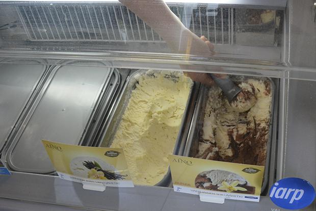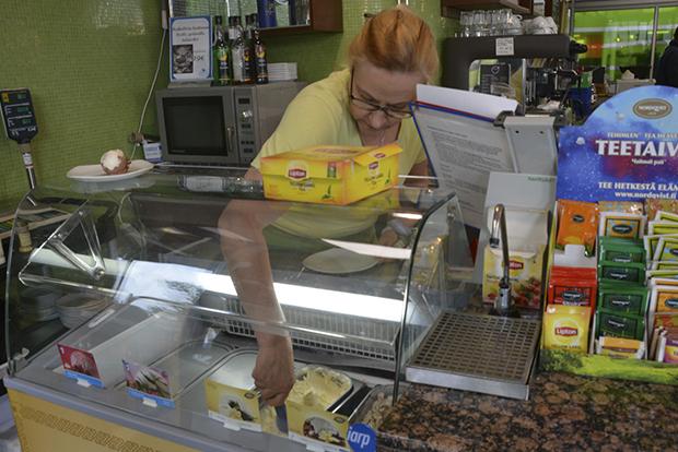 Raili Lauren pyörittelee meille pallot Aino-jäätelöstä. Näkyvillä olevasta valikoimasta suosituimmat maut ovat vanilja ja vanilja-suklaa.