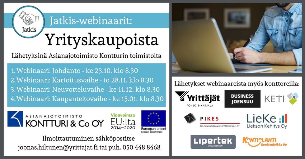 Tervetuloa kuulemaan netin välityksellä yrityskauppojen vaiheista! Nyt on mahtava tilaisuus tutustua yrityskauppaprosessiin sängystä nousematta, aamiaispöydästäsi tai vaikka koiran kanssa lenkkeillessä. Webinaarit järjestetään joka kuukausi neljässä eri jaksossa ja ne ovat täysin maksuttomia.