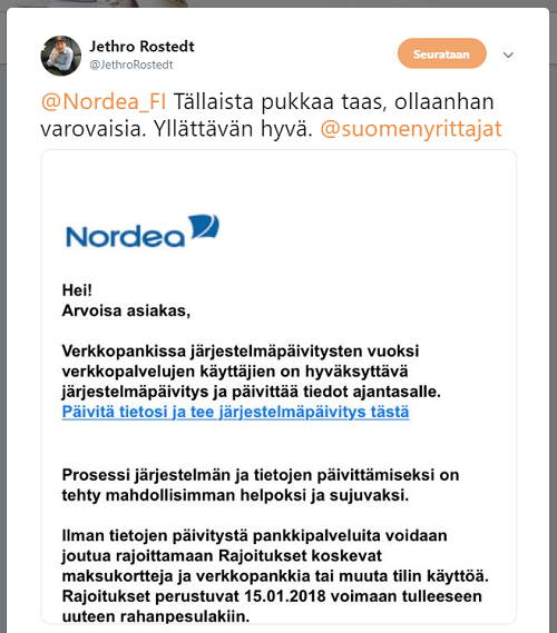 Aninkaisten Kiinteistövälityksen toimitusjohtaja ja omistaja, mediapersoona Jethro Rostedt sai Nordean nimissä lähetetyn huijausyrityksen työsähköpostiinsa. Hän kirjoitti asiasta perjantaina Twitterissä ja jakoi twiittinsä myös Suomen Yrittäjien sivuille.