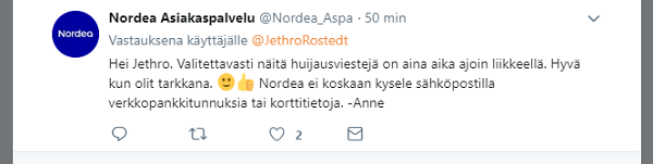 Nordean asiakaspalvelu vastasi perjantaina Rostedtin viestiin ja muistutti, että pankki ei koskaan kysele sähköpostilla verkkopankkitunnuksia tai korttitietoja.