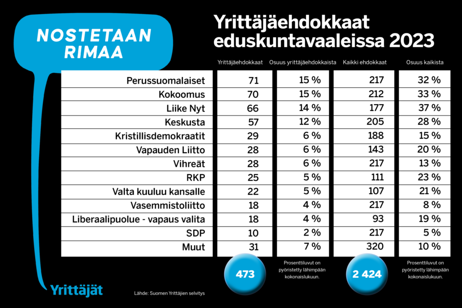 Huhtikuun eduskuntavaaleissa on ehdolla 473 yrittäjää. Suurin yrittäjäpuolue on ehdokasmäärällä mitattuna perussuomalaiset (71 ehdokasta), toiseksi suurin kokoomus (70 ehdokasta) ja kolmanneksi Liike Nyt (64 ehdokasta). Suhteessa eniten yrittäjäehdokkaita on Liike Nytin listoilla (37 prosenttia). Yrittäjäehdokkaiden määrä kasvoi viime eduskuntavaaleista selvästi.