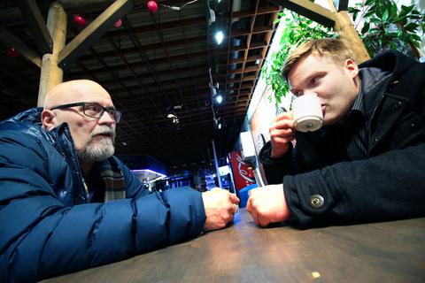 Raimo Kortesalmi, 57, ja Markus Ranua, 30, istahtavat ranualaisen pizzerian pöytään kahvikupit kädessään.