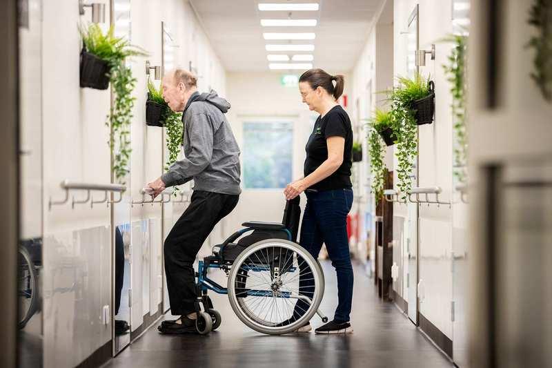 Matti Puumala tekee jumppaliikkeitä fysioterapeutti Irma Turpeisen opastuksella. Kuva: Vesa Saivo