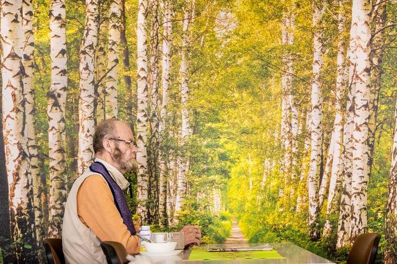 Pentti Mäkinen nauttii lounasta kesäisen koivikon maisemassa. Kuva: Vesa Saivo