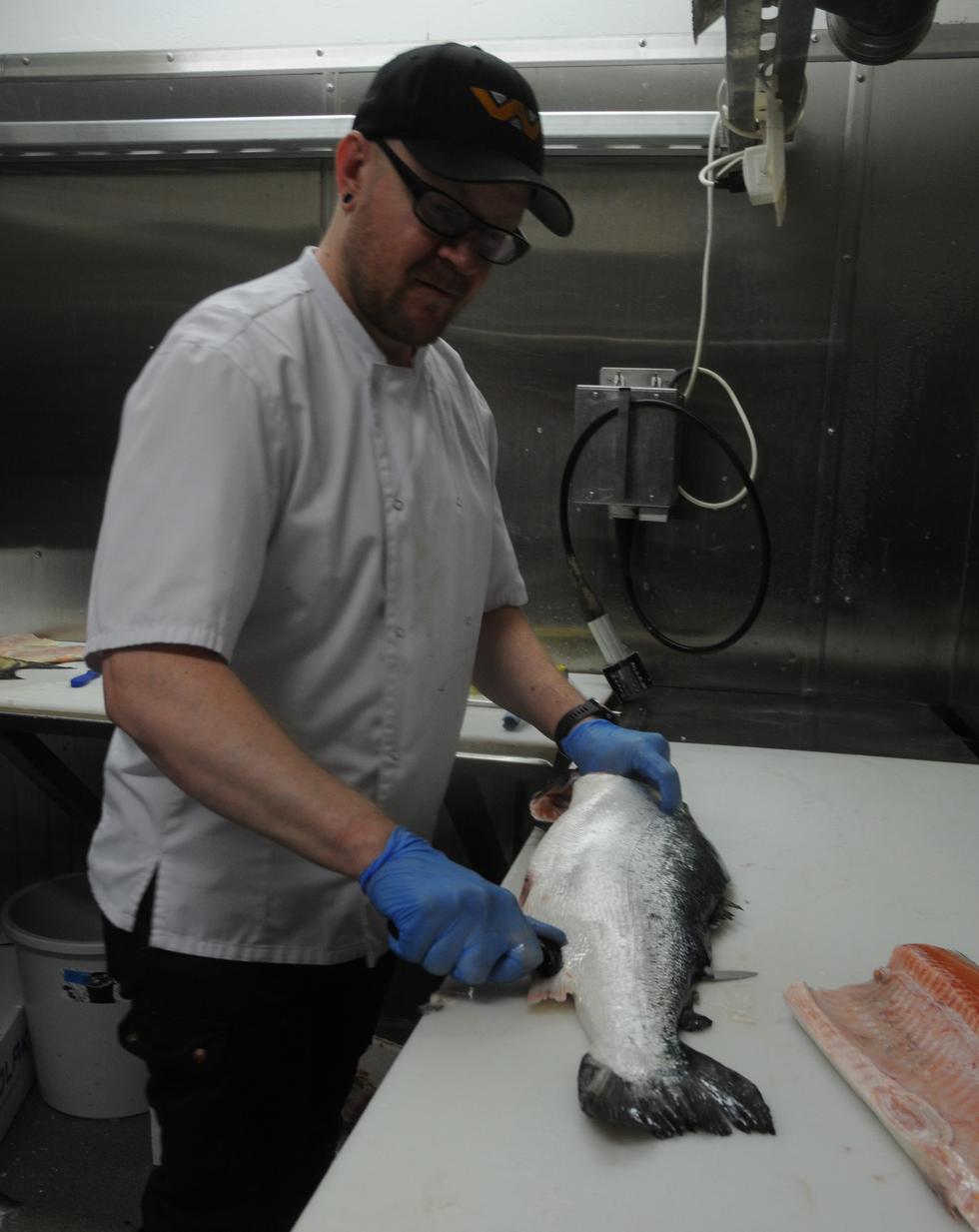 KAUAA EI ammattimiehellä lohen paloittelussa aikaa tuhraannu. On Sami Kaukolinnalla ollut tosin aikaa harjoitellakin. Hän on ollut yrityksen leivissä jo kymmenkunta vuotta.