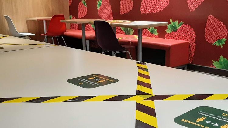 Keltaiset teipit hampurilaisravintolan sisällä kertovat karua kieltä. Kantahämäläiset ravitsemusliikkeet saavat ottaa sisään vain puolet asiakaspaikkamääristä. Toisen aallon rajoitukset koetaan kohtuuttomina ja alan omia toimia väheksyvinä. Nyt on käynnistymässä pudotuspeli, joka tuo mukanaan lomautuksia ja katkaisee kohentuneen työllisyyskehityksen.