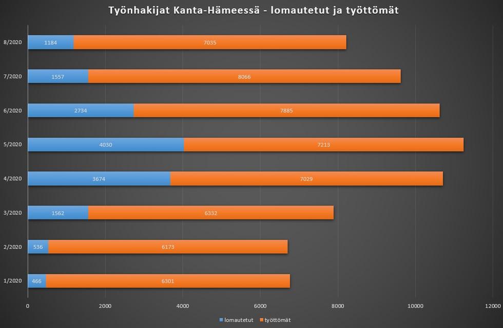 Lomautusten synkkä huippulukema koettiin toukokuussa. Tuolloin työttömiä työnhakijoita oli Kanta-Hämeessä kaikkiaan 11 243. Heistä lomautettuina oli 4030. Loppukesä paransi tilannetta ja tipautti samalla lomautettujen määrää neljännekseen huipusta. Työttömien määrä pysyi toukokuuhun verrattuna samalla tasolla.