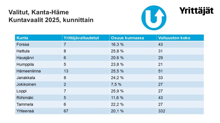 Yrittäjiä pääsi runsaasti valtuustoihin sekä kunta- että aluevaaleissa. Kanta-Hämeessä valtuutetuista 20 prosenttia on yrittäjiä ja aluevaltuutetuista 20 prosenttia.