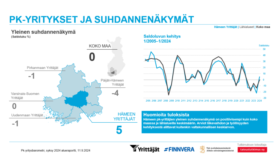 Hämeen pk-yrittäjien yleinen suhdannenäkymä on positiivisempi kuin koko maassa ja lähialueilla keskimäärin. Arviot liikevaihdon ja työllisyyden kehityksestä alittavat kuitenkin valtakunnallisen keskiarvon.