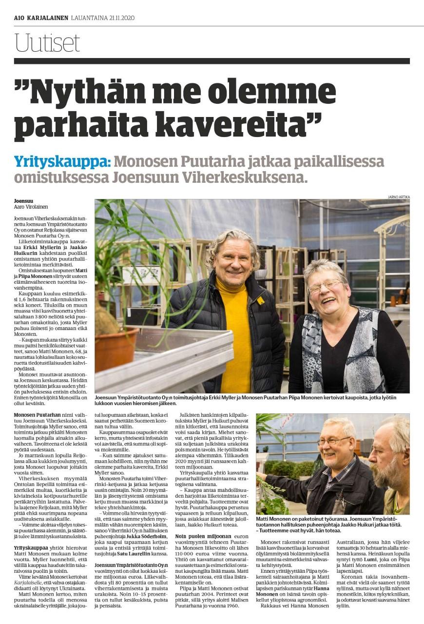 13.8.2021 klo 11:37 Uutinen #omistajanvaihdos Karjalainen: Monosen Puutarha jatkaa paikallisessa omistuksessa Tämä teksti on konekäännetty. Jaa Kopioitu leikepöydälle