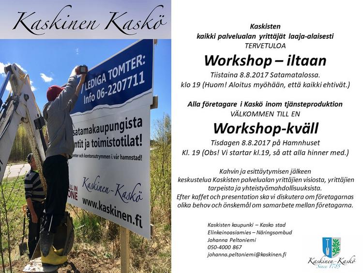 Kaskisten uusi elinkeinoasiamies Johanna Peltoniemi rakentaa yritysten kanssa yhteistyössä kaupungille uutta elinkeinostrategiaa. Eri toimialojen painopisteitä ja kehittämiskohteita on pohdittu eri workshopeissa kesän aikana. Seuraavaksi kutsutaan koolle mahdollisimman laaja-alaista joukkoa kaupungin palvelualan yrityksiä. Tervetuloa Kaskisten satamataloon tiistaina 8.8. klo 19 alkaen!