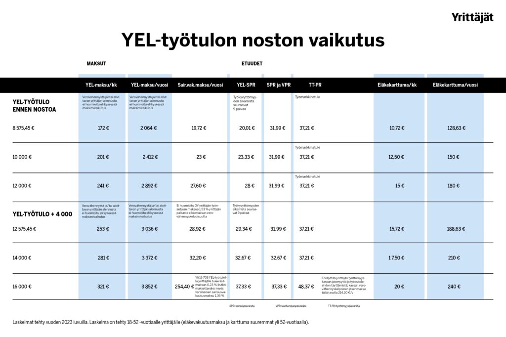Yrittajat.fi laati laskelman siitä, miten 4 000 euron korotus YEL-työtuloon vaikuttaa yrittäjän YEL-maksuihin, sosiaaliturvaan ja eläkekertymään. Laskelma on tehty 18–52 -vuotiaalle yrittäjälle.
